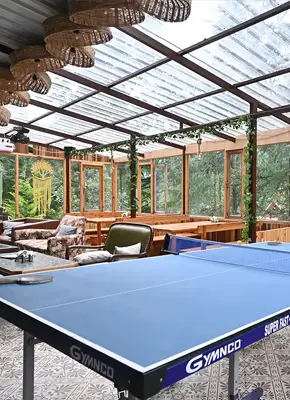 Spacious attic room designed for groups, with twin beds, modern interiors and wide panoramic windows overlooking Parvati Valley’s beauty.