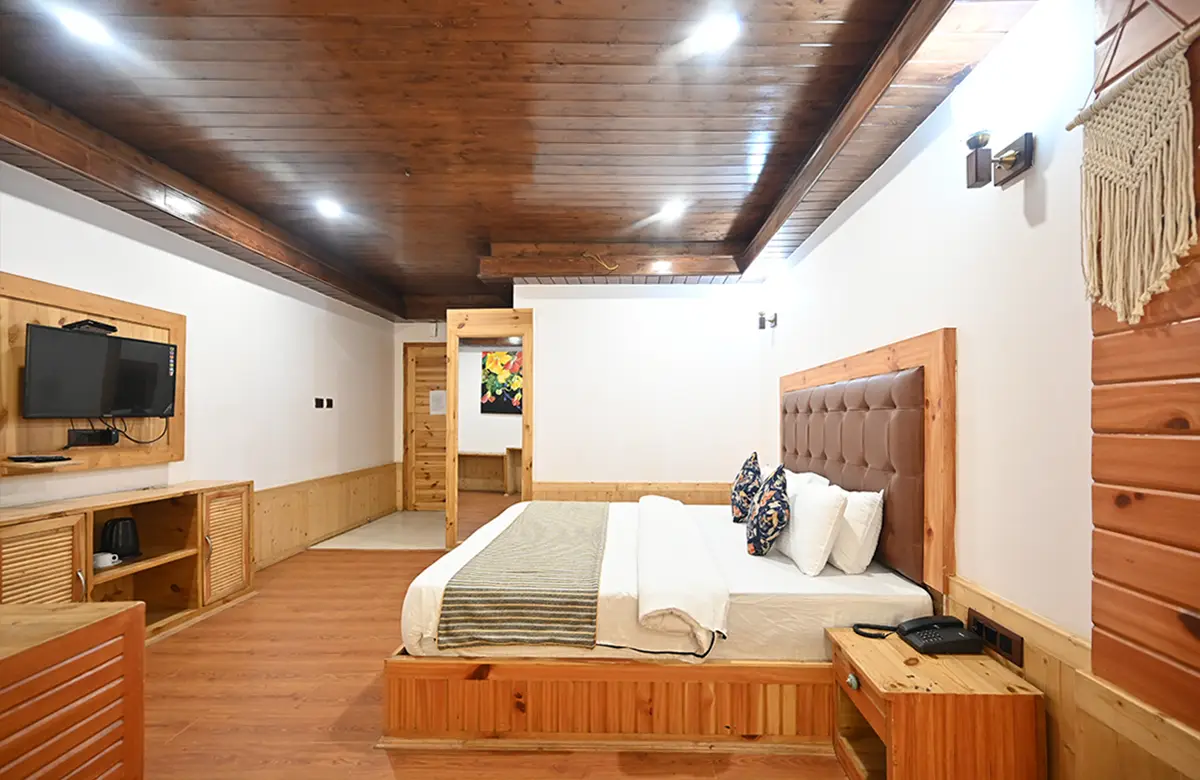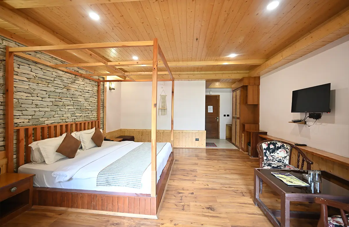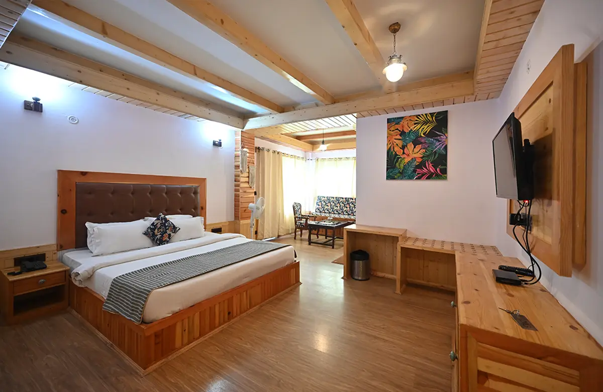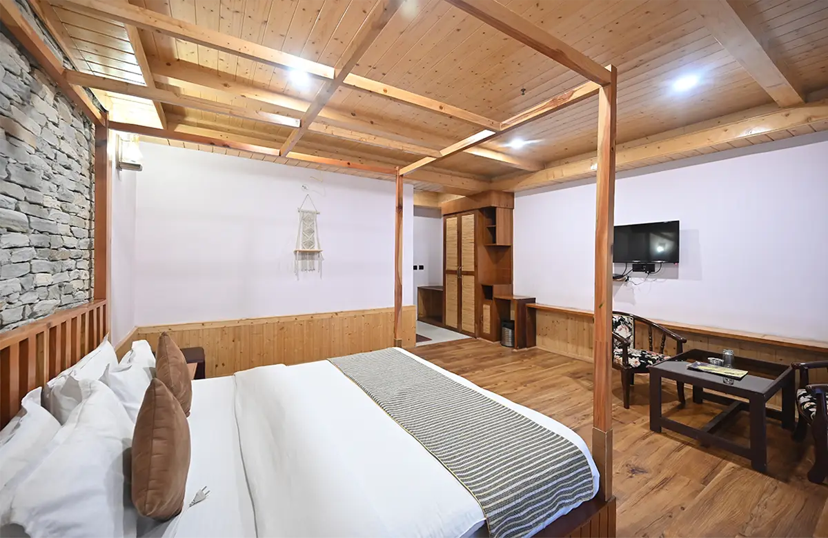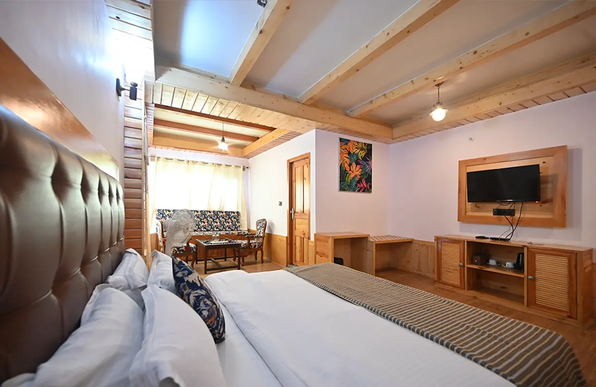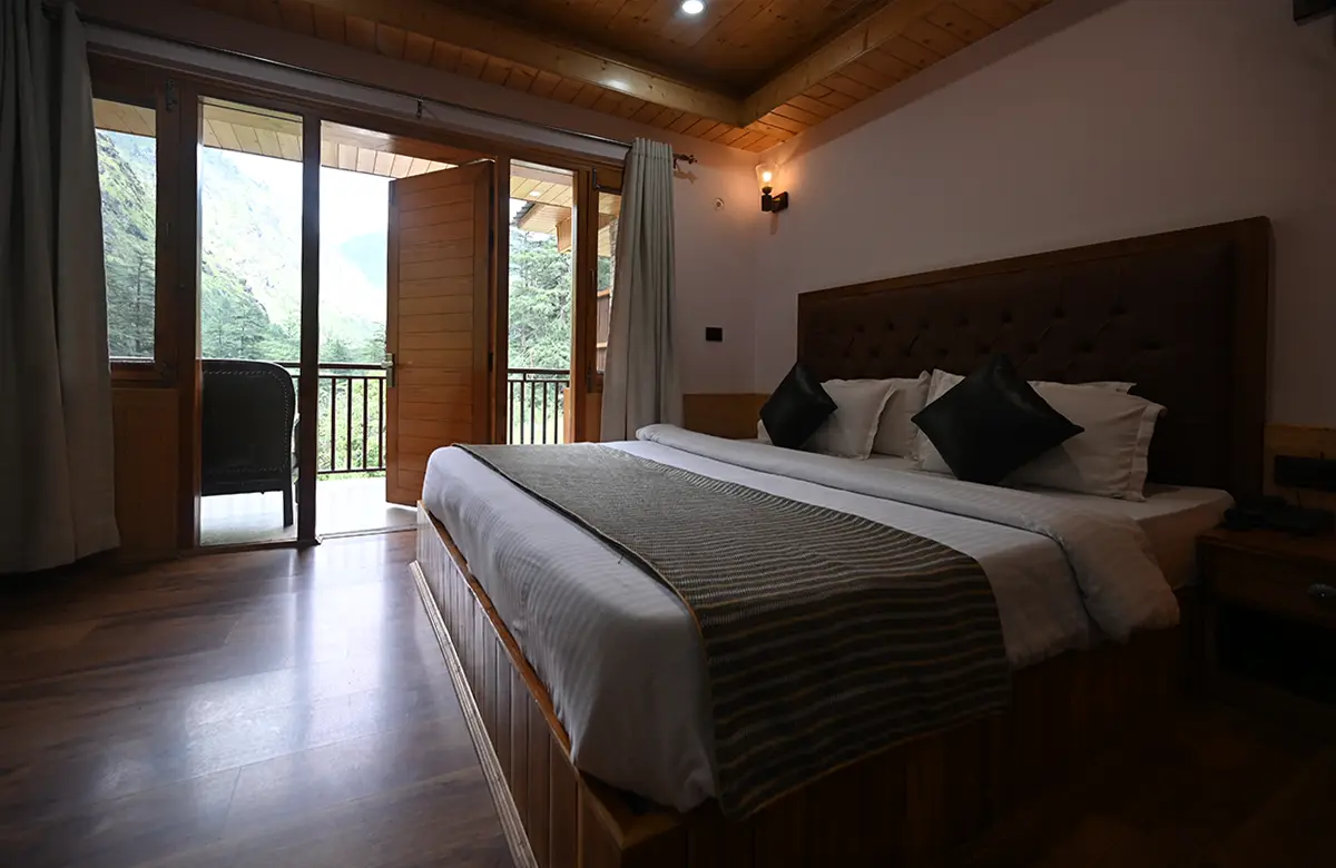 Spacious valley-view rooms with king beds, wooden interiors, LED TV, seating areas and modern amenities for a restful stay in Kullu.
