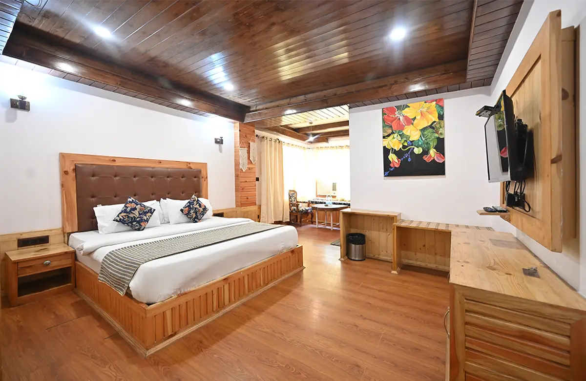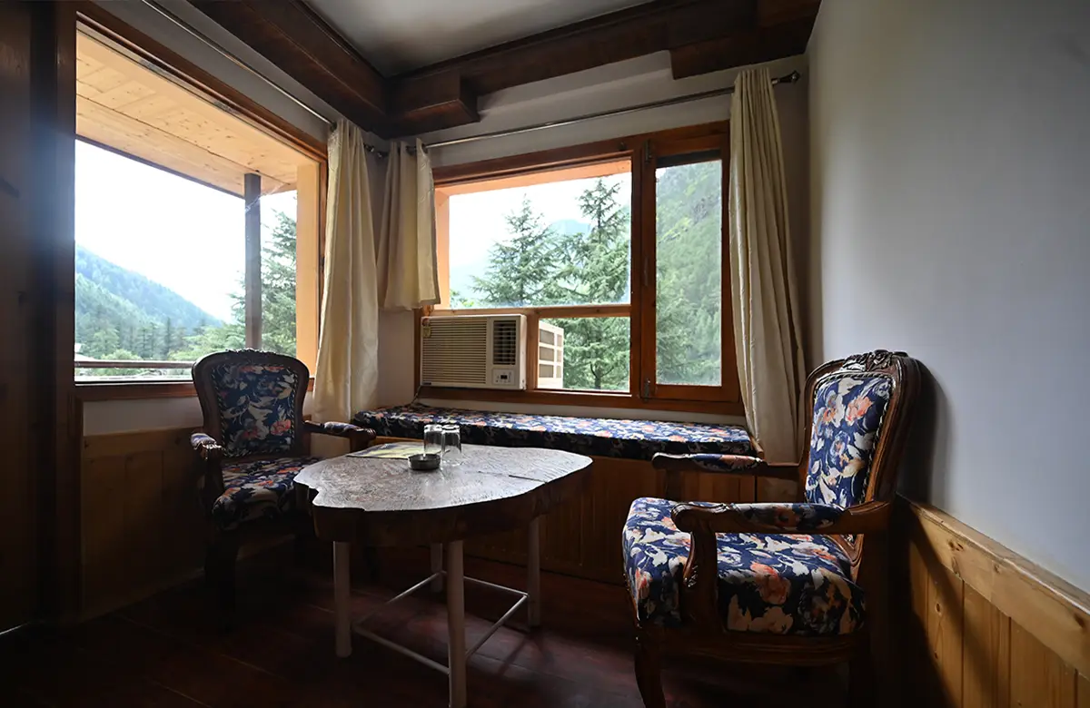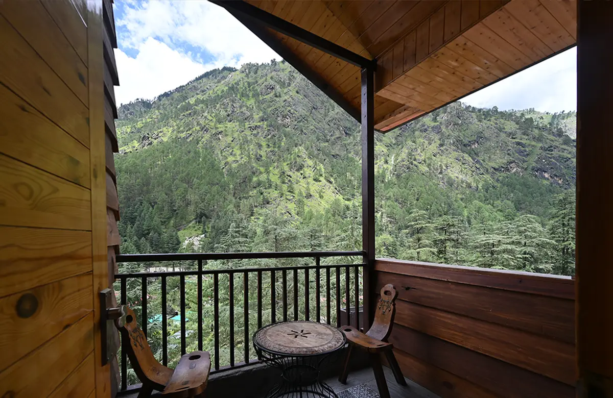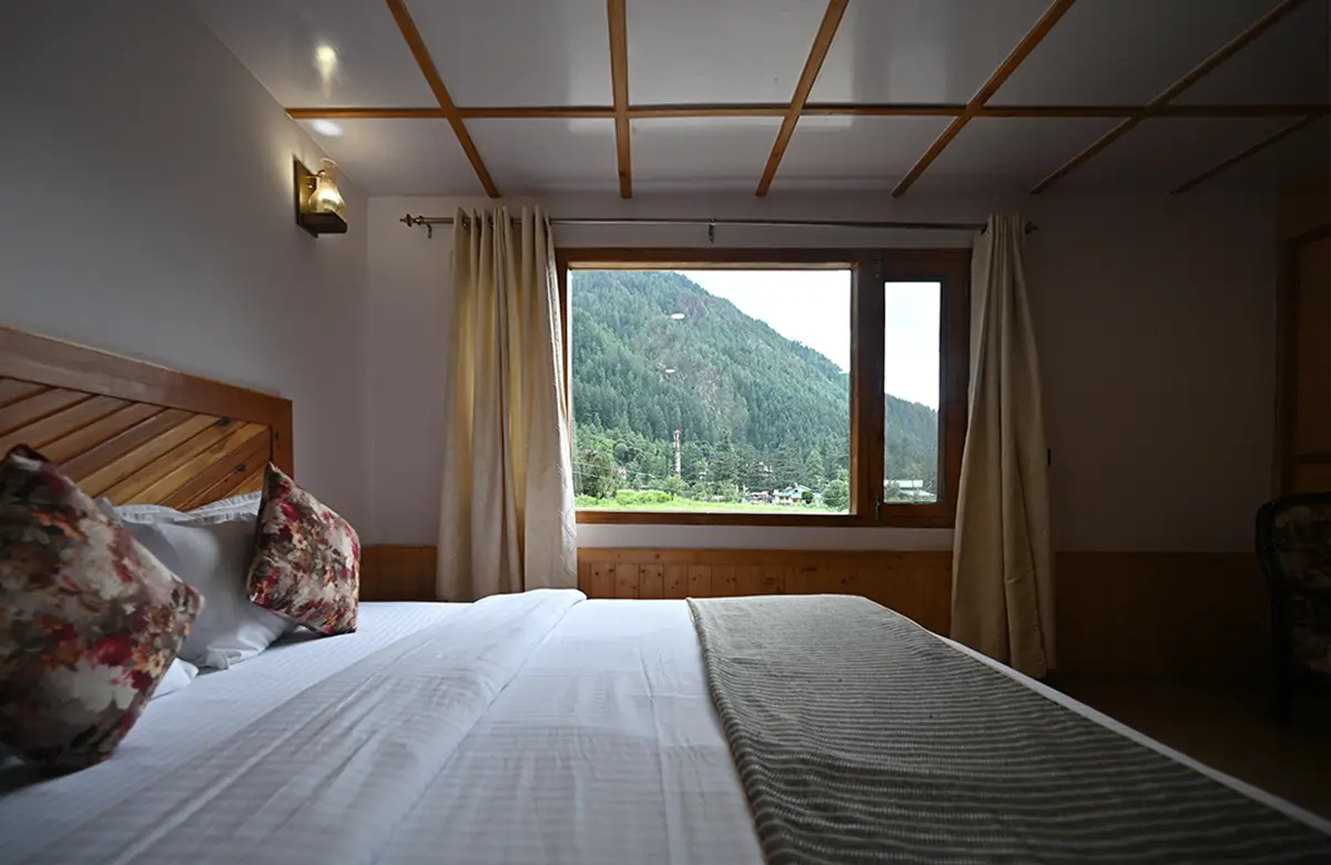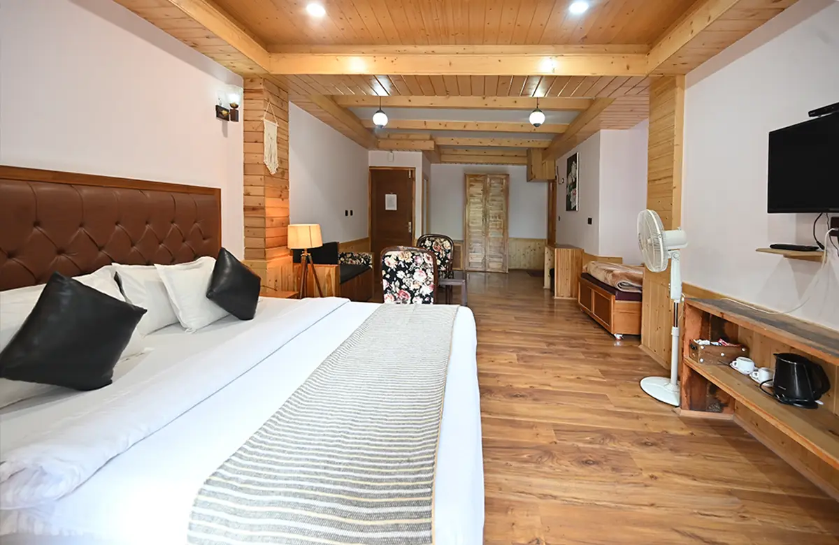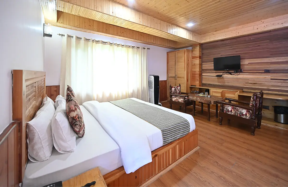 Spacious valley-view rooms with king beds, wooden interiors, LED TV, seating areas and modern amenities for a restful stay in Kullu.