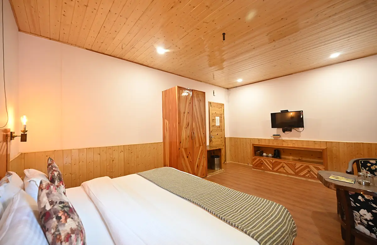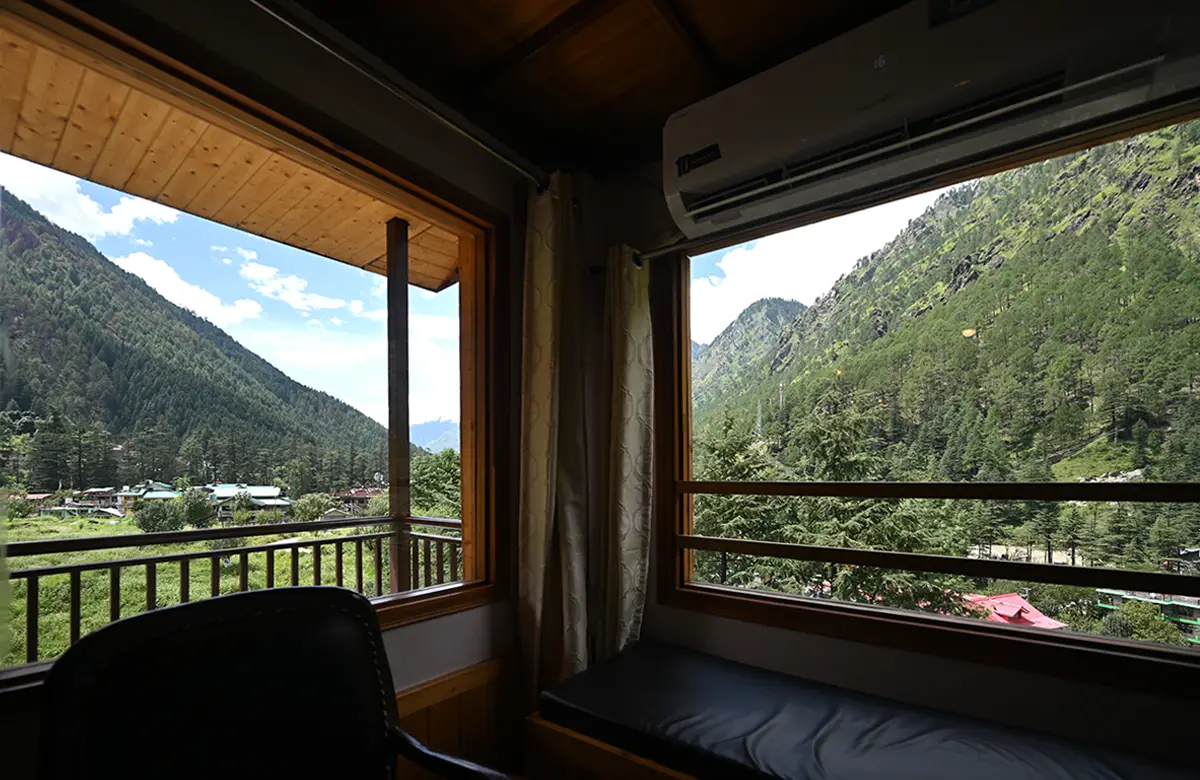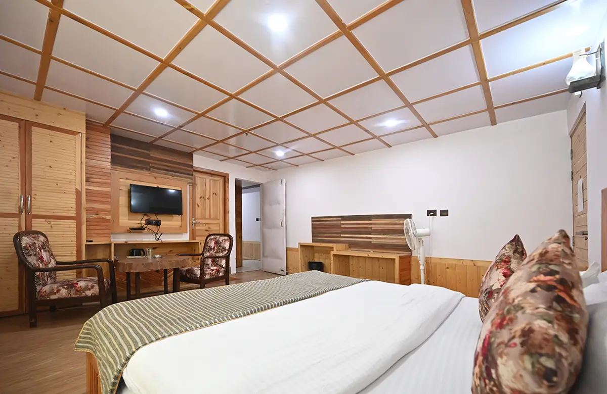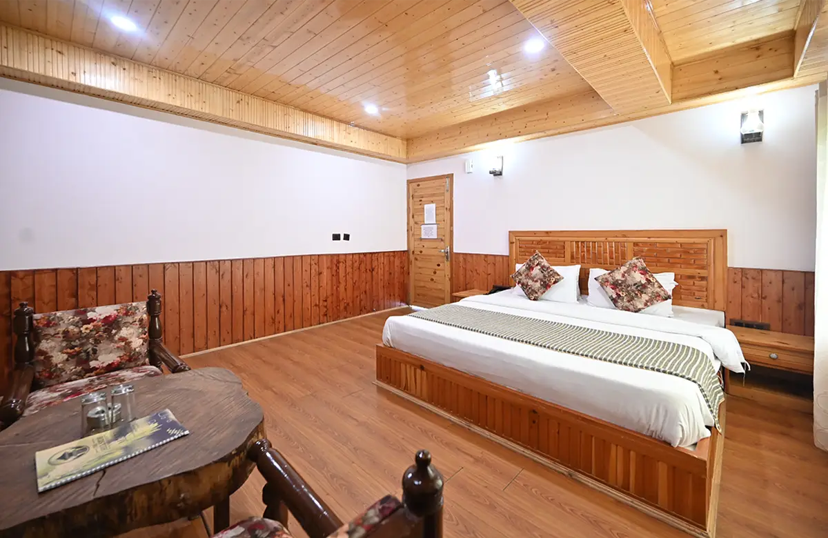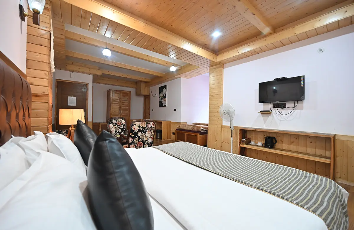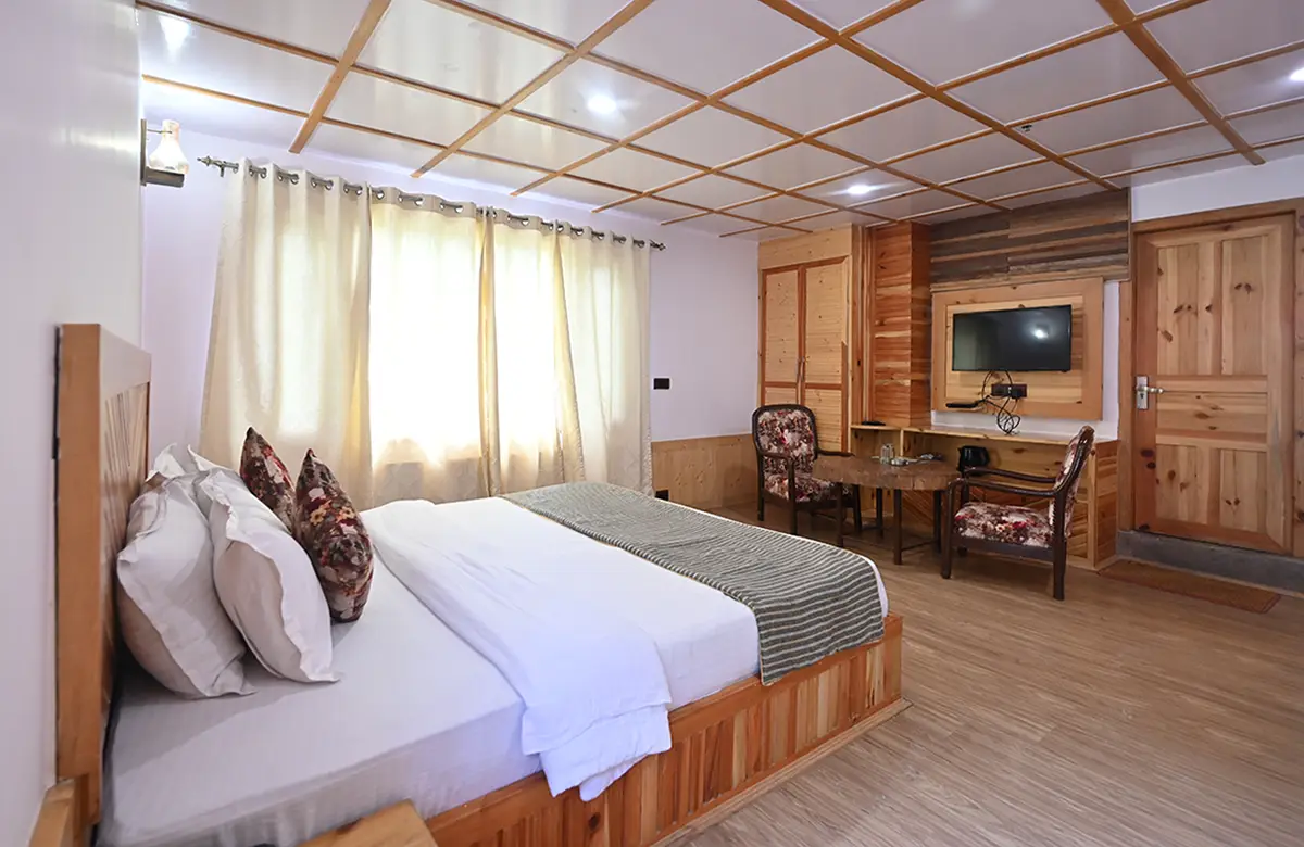 Spacious valley-view rooms with king beds, wooden interiors, LED TV, seating areas and modern amenities for a restful stay in Kullu.