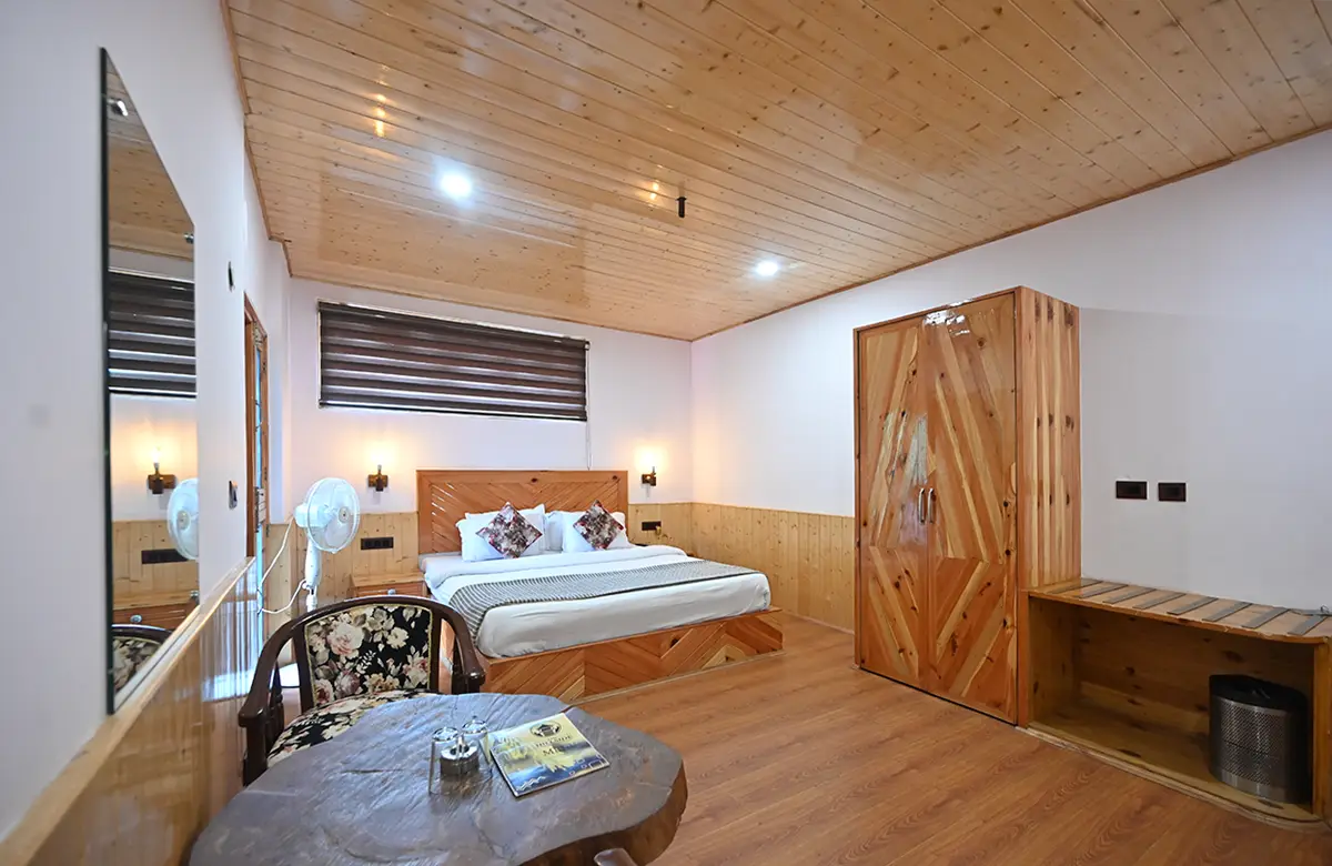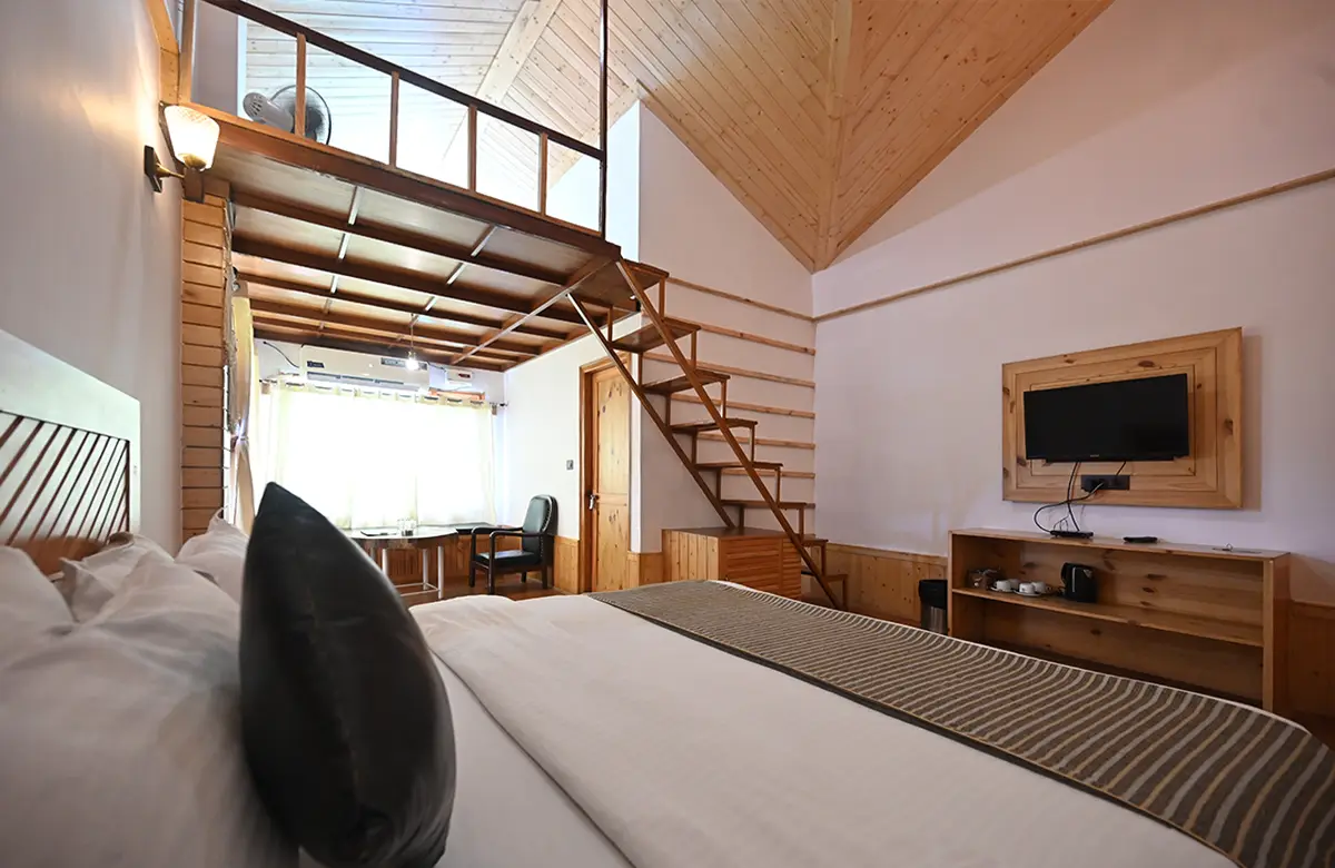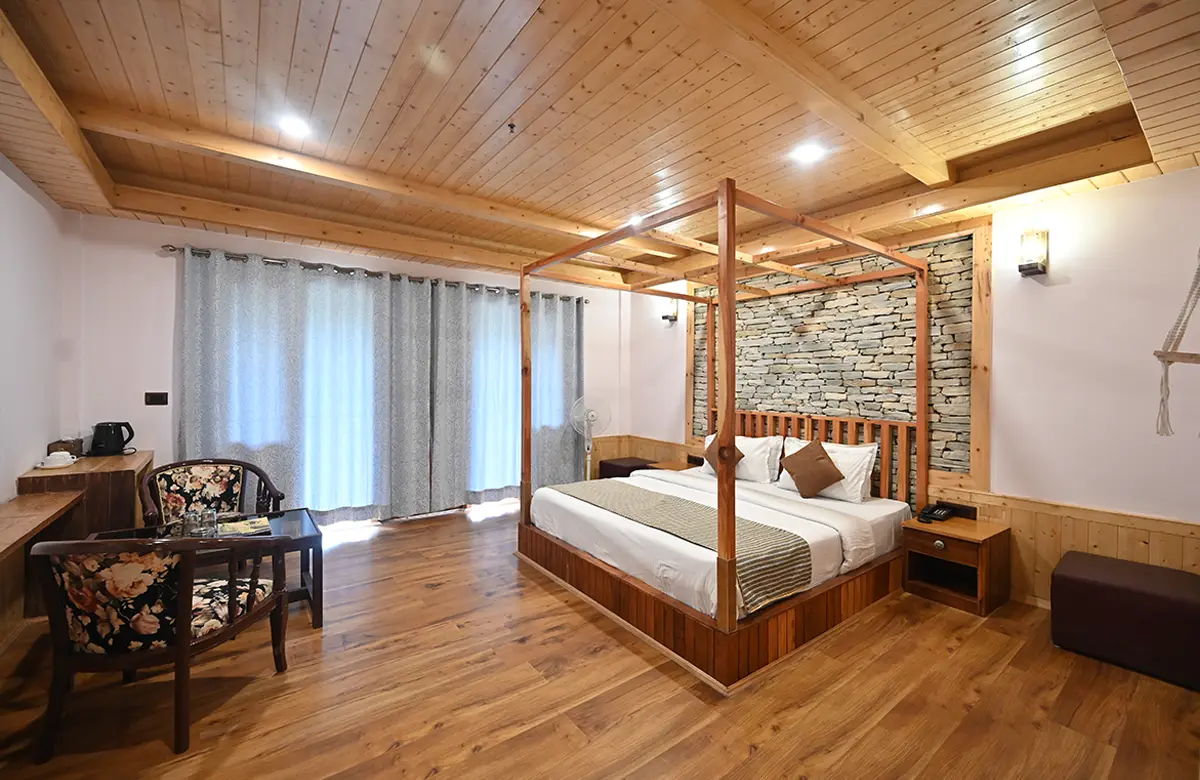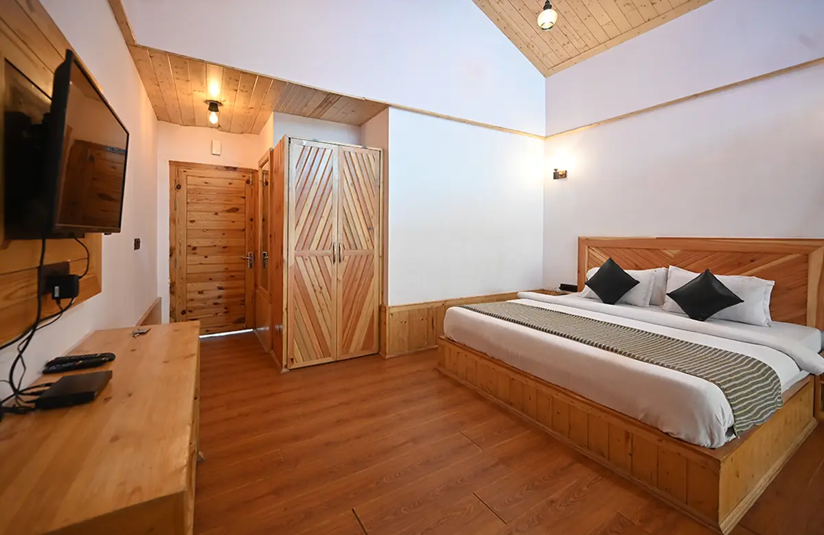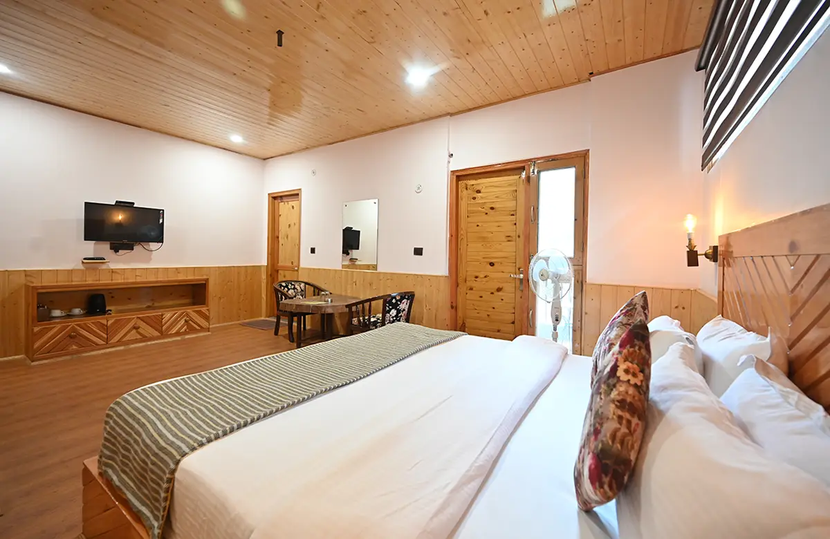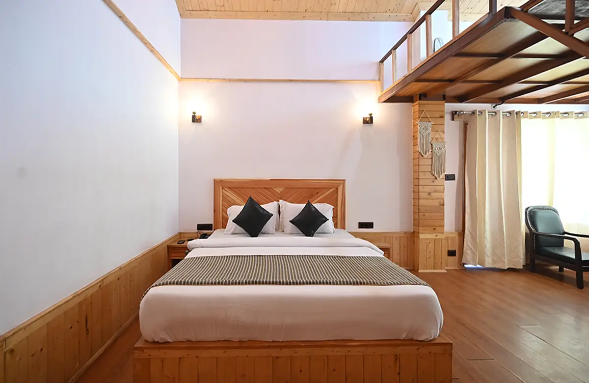 Spacious valley-view rooms with king beds, wooden interiors, LED TV, seating areas and modern amenities for a restful stay in Kullu.