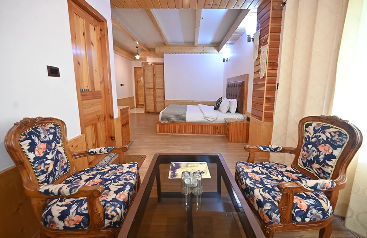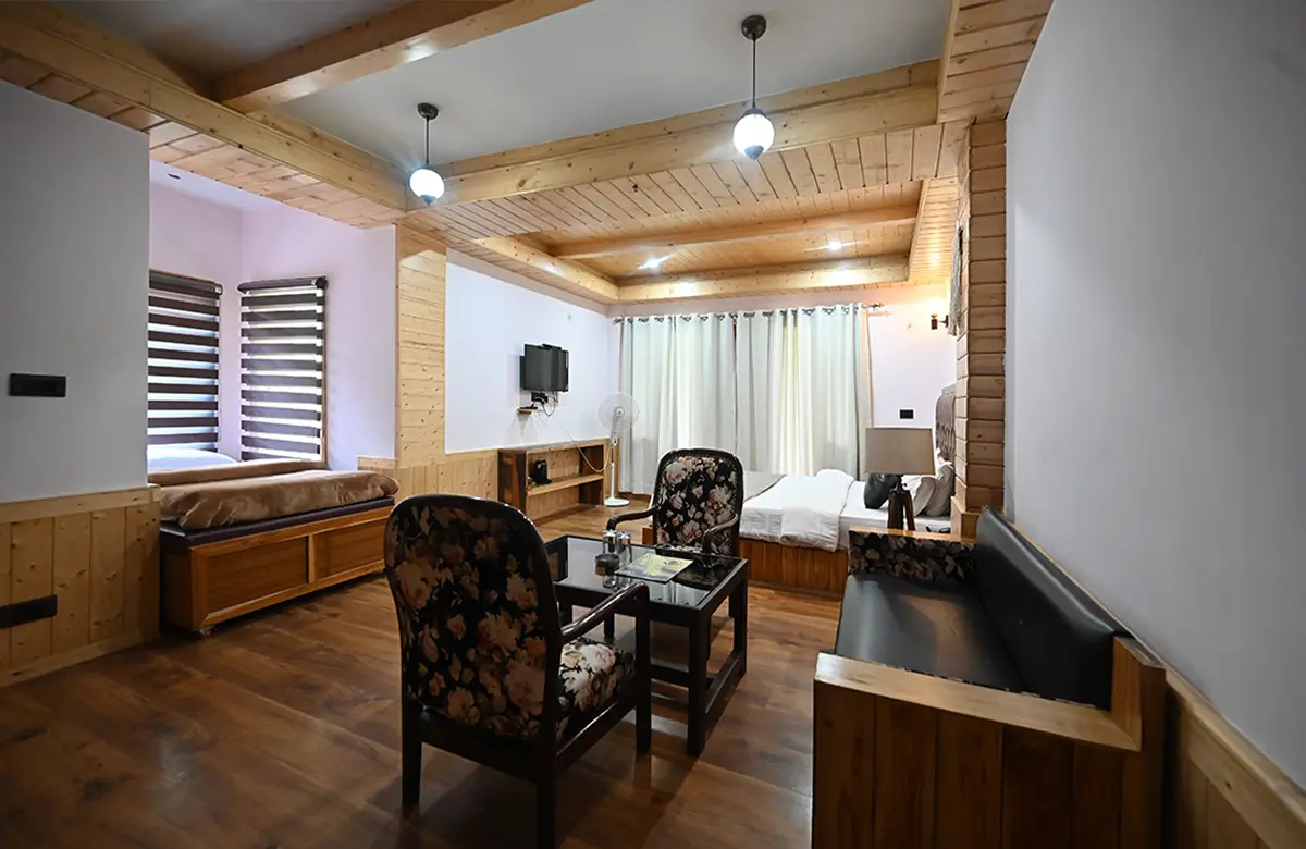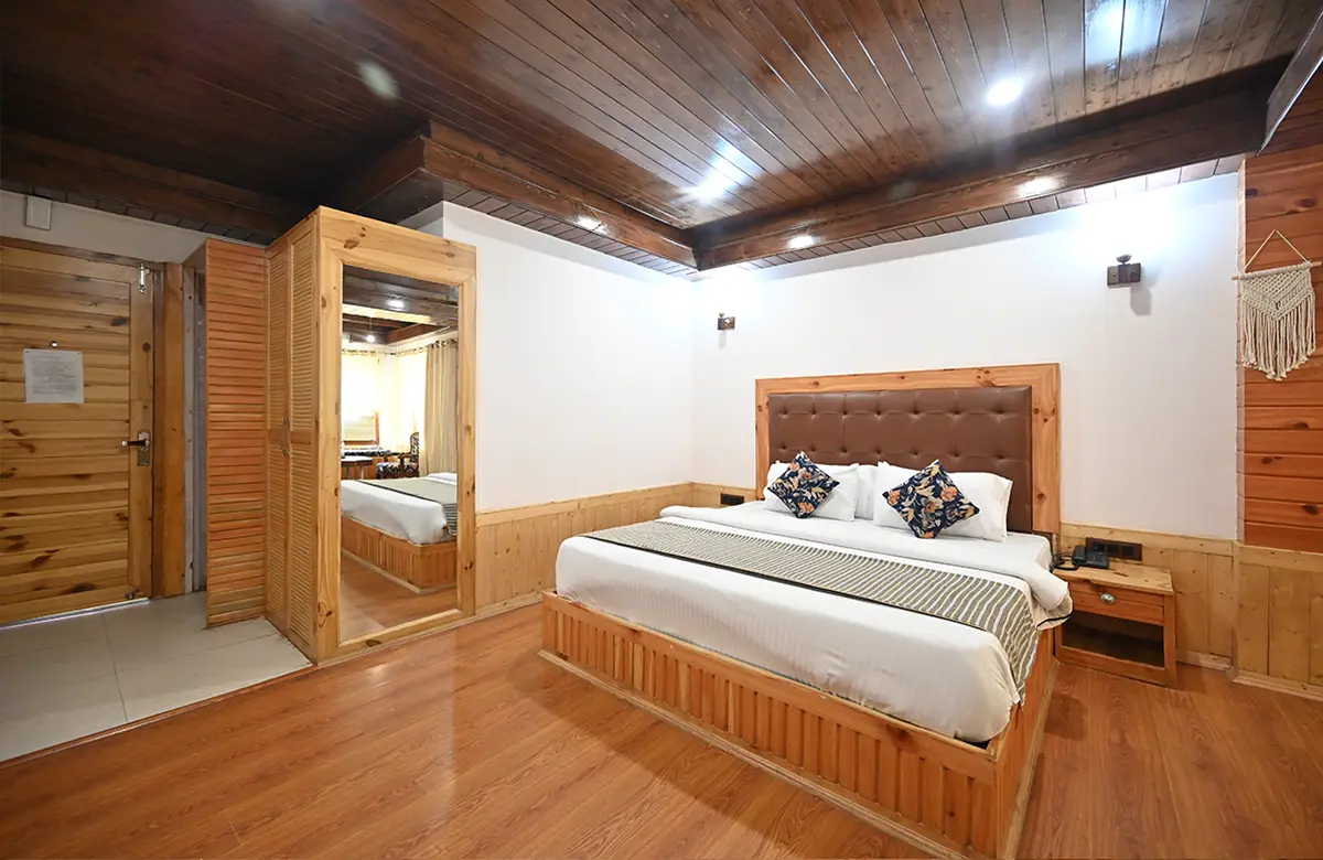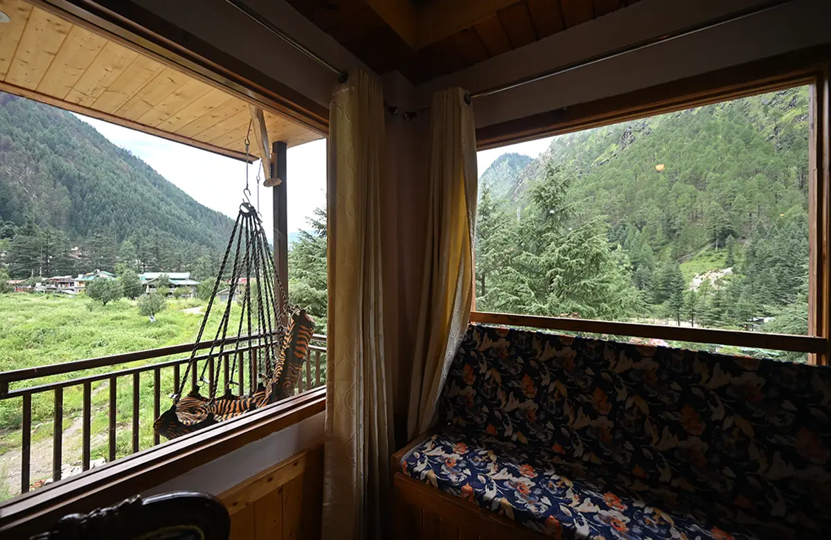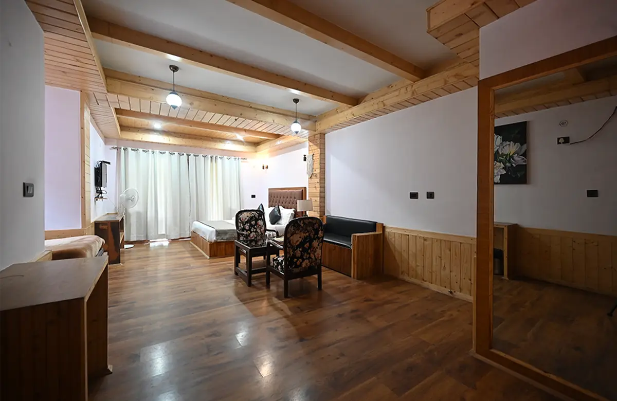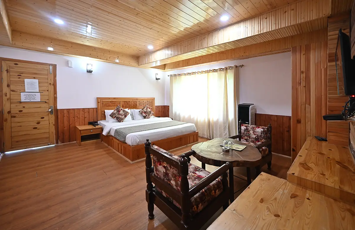 Spacious valley-view rooms with king beds, wooden interiors, LED TV, seating areas and modern amenities for a restful stay in Kullu.