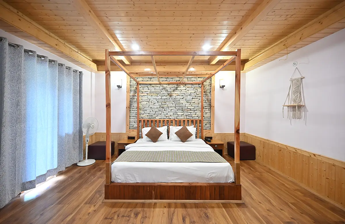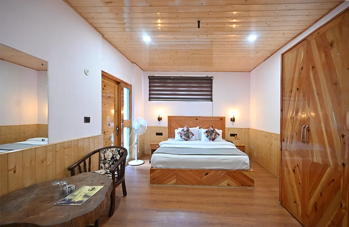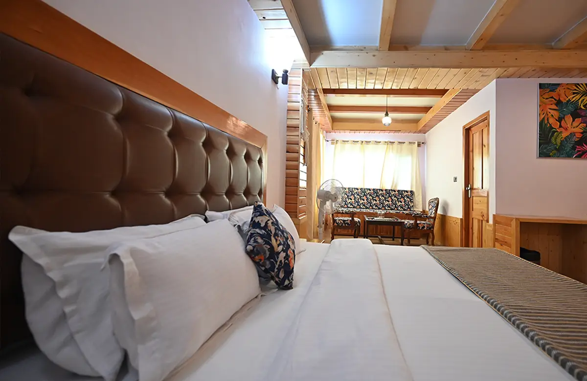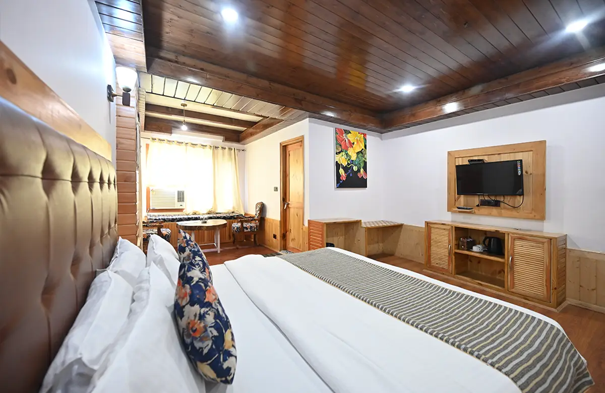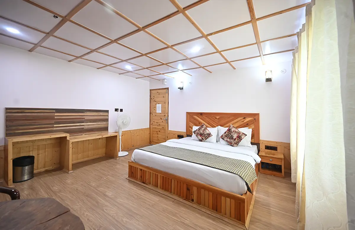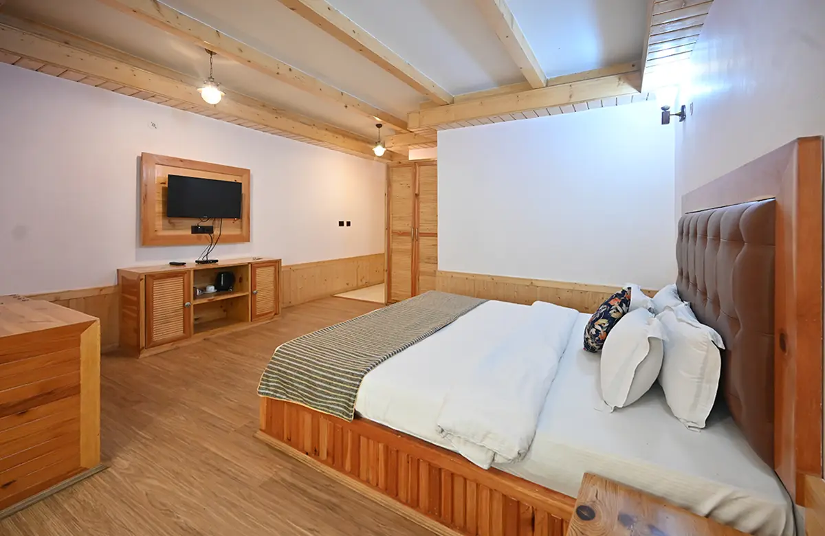 Spacious valley-view rooms with king beds, wooden interiors, LED TV, seating areas and modern amenities for a restful stay in Kullu.