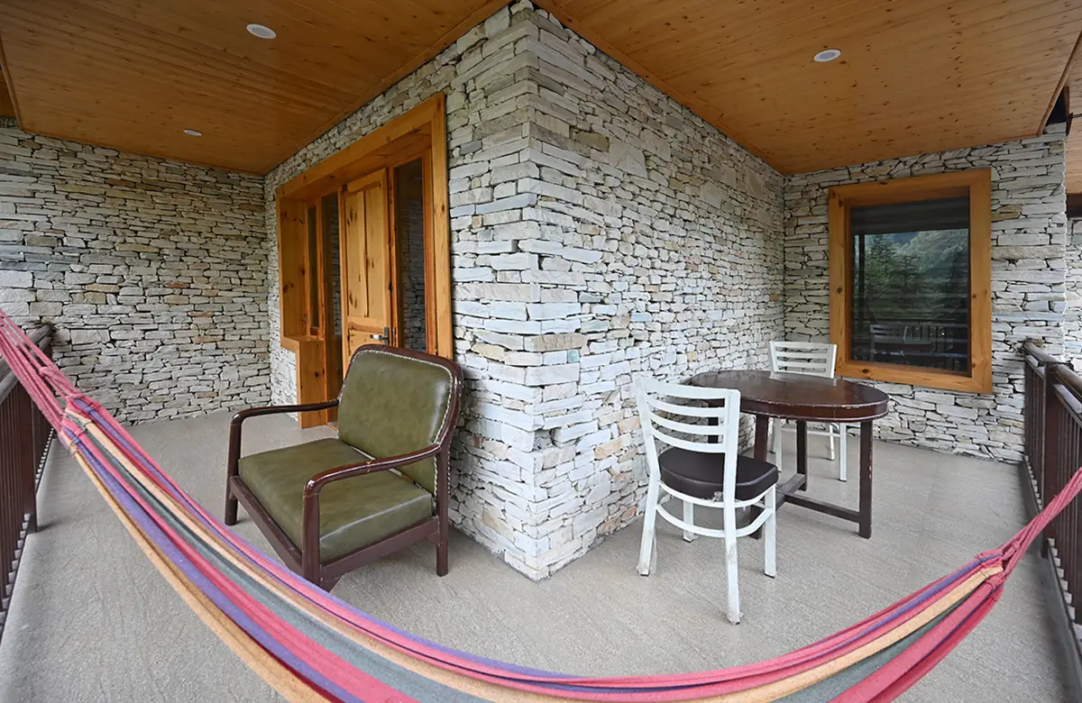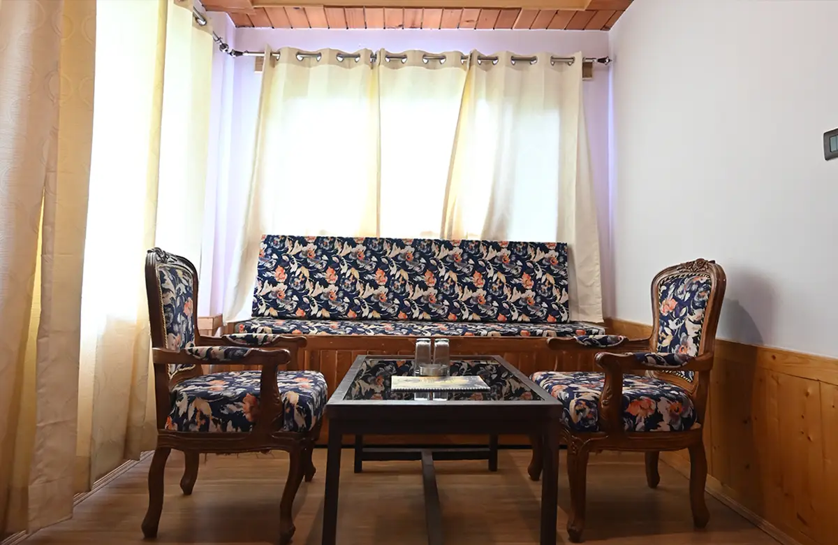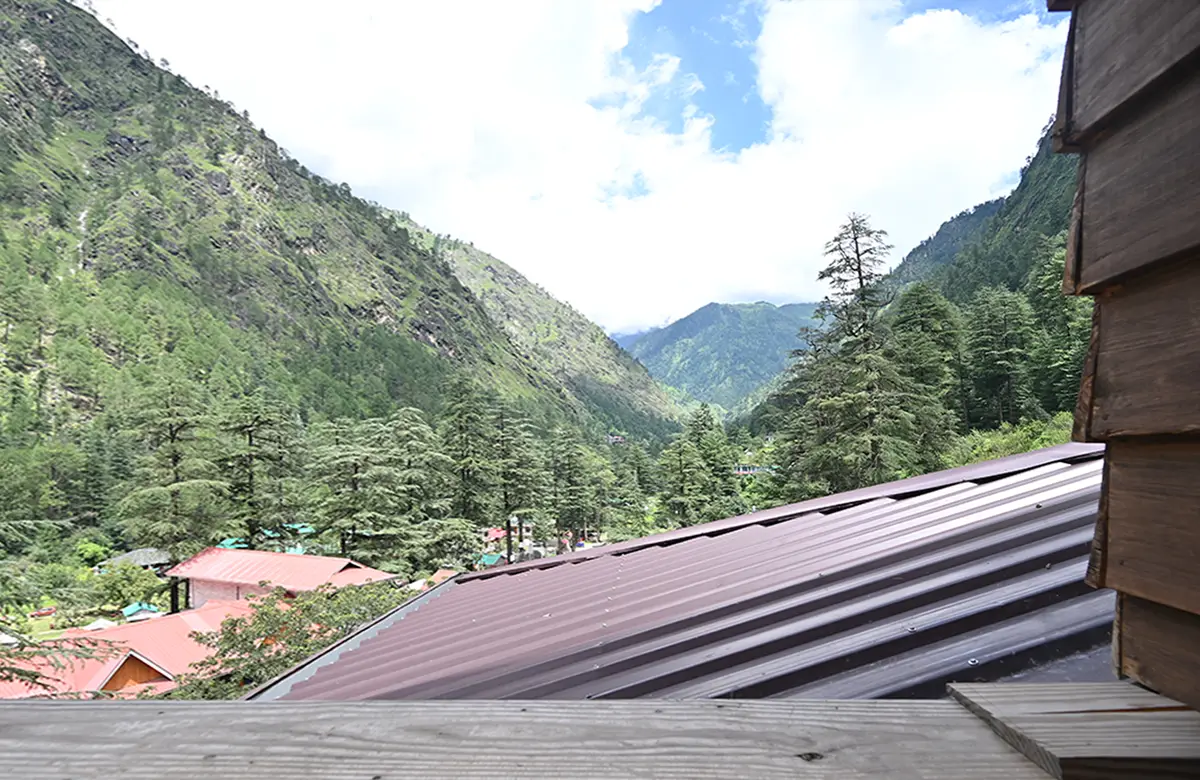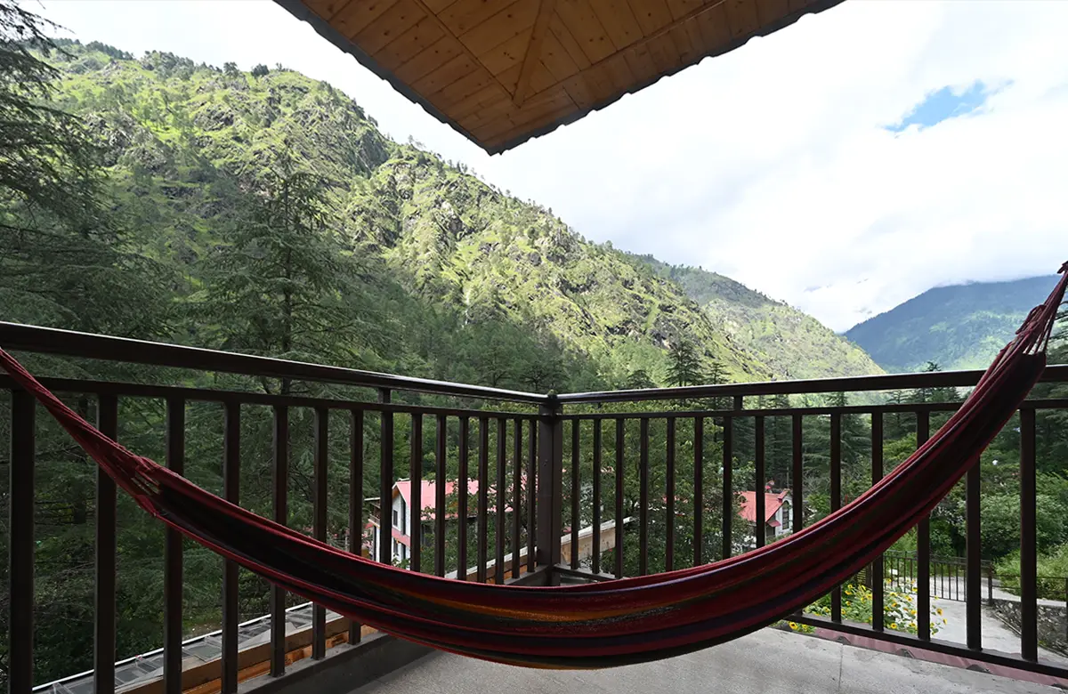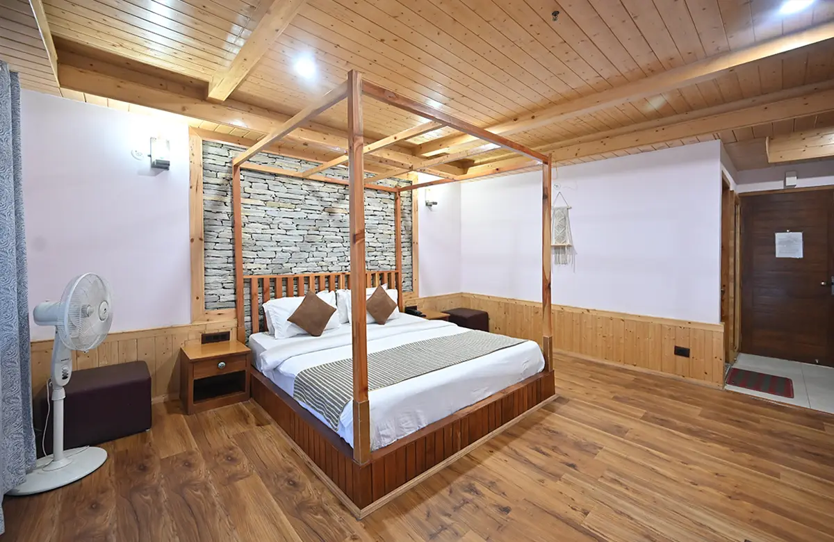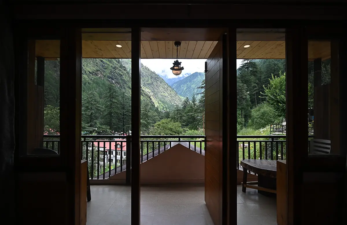 Spacious valley-view rooms with king beds, wooden interiors, LED TV, seating areas and modern amenities for a restful stay in Kullu.