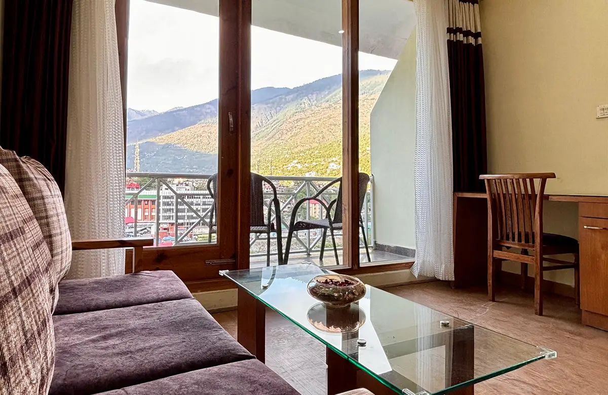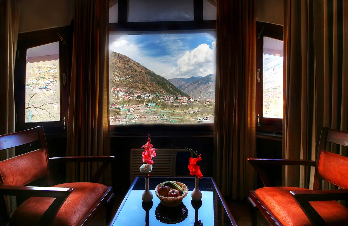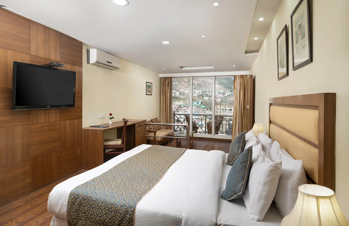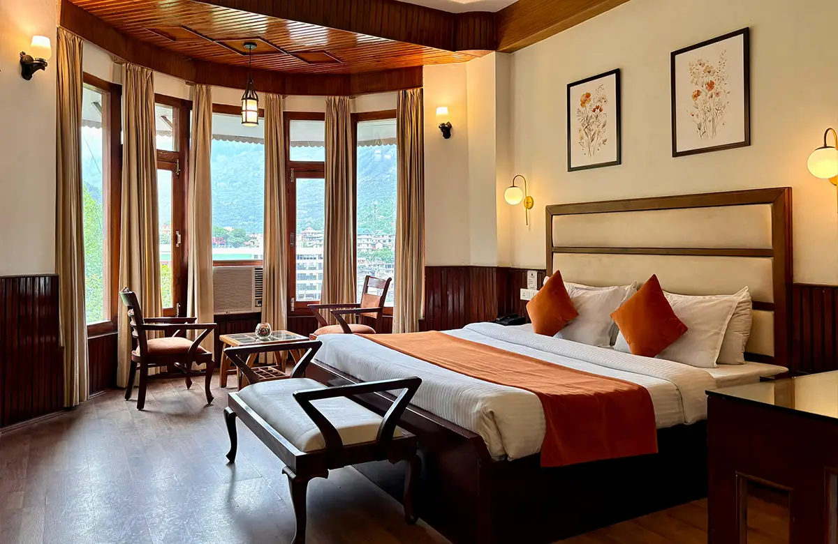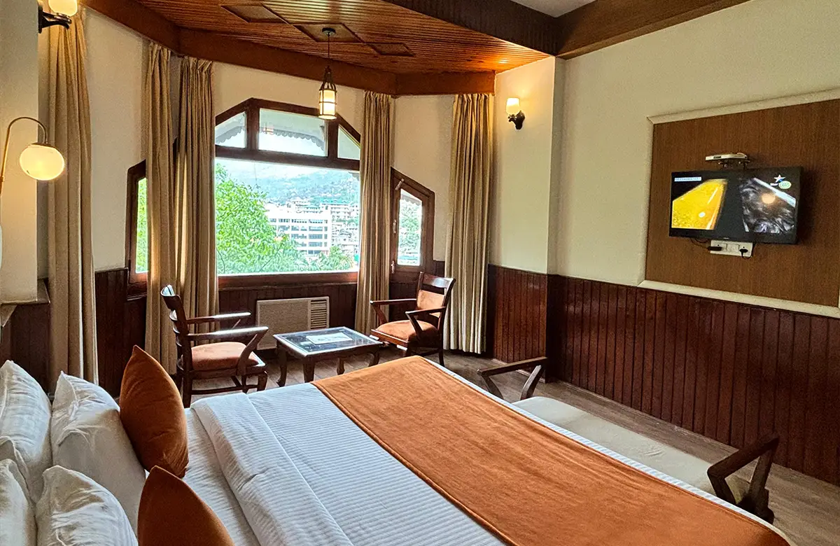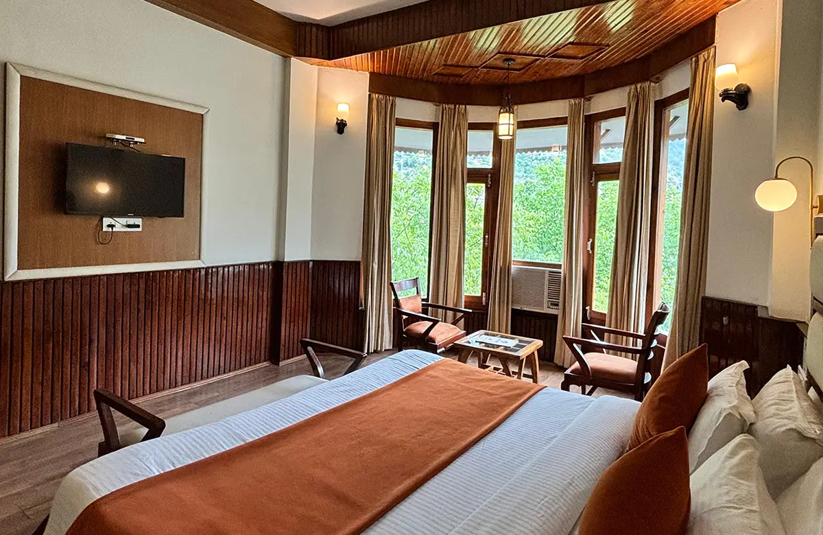 Spacious valley-view rooms with king beds, wooden interiors, LED TV, seating areas and modern amenities for a restful stay in Kullu.