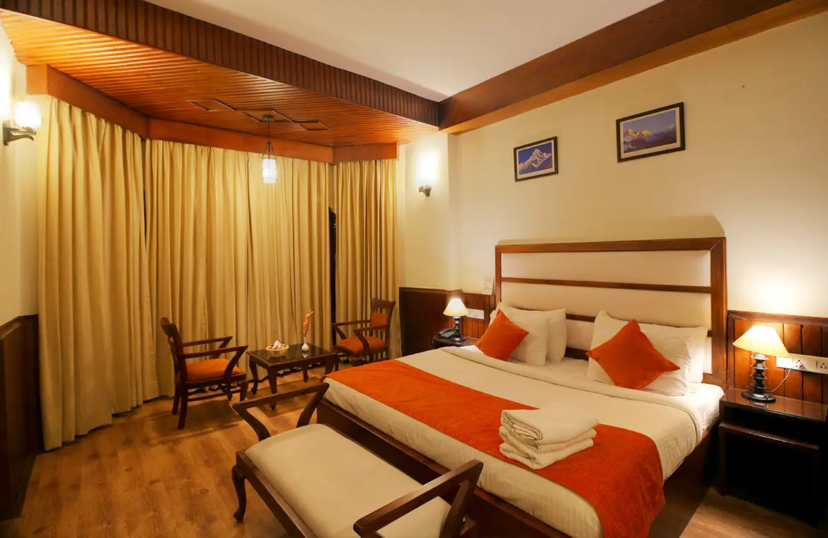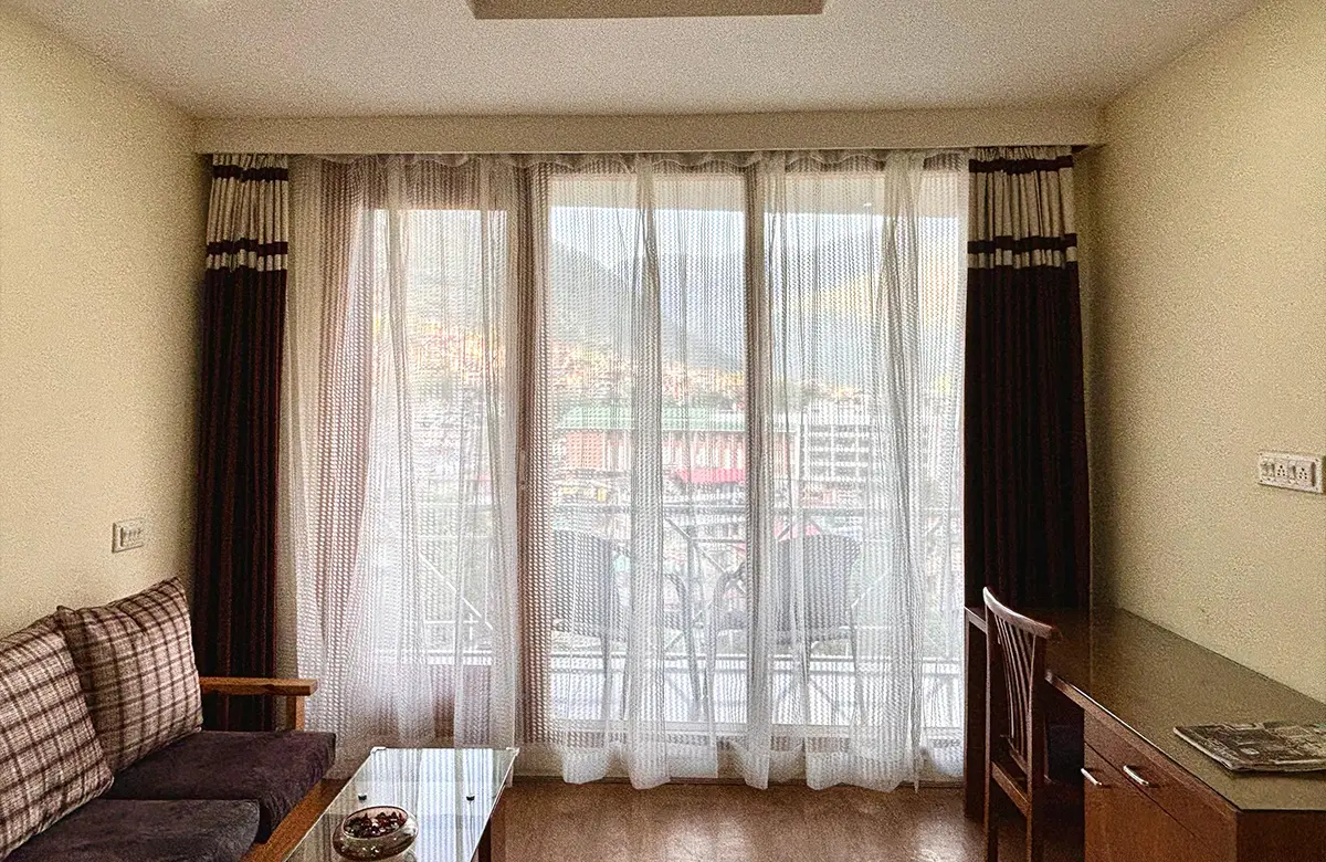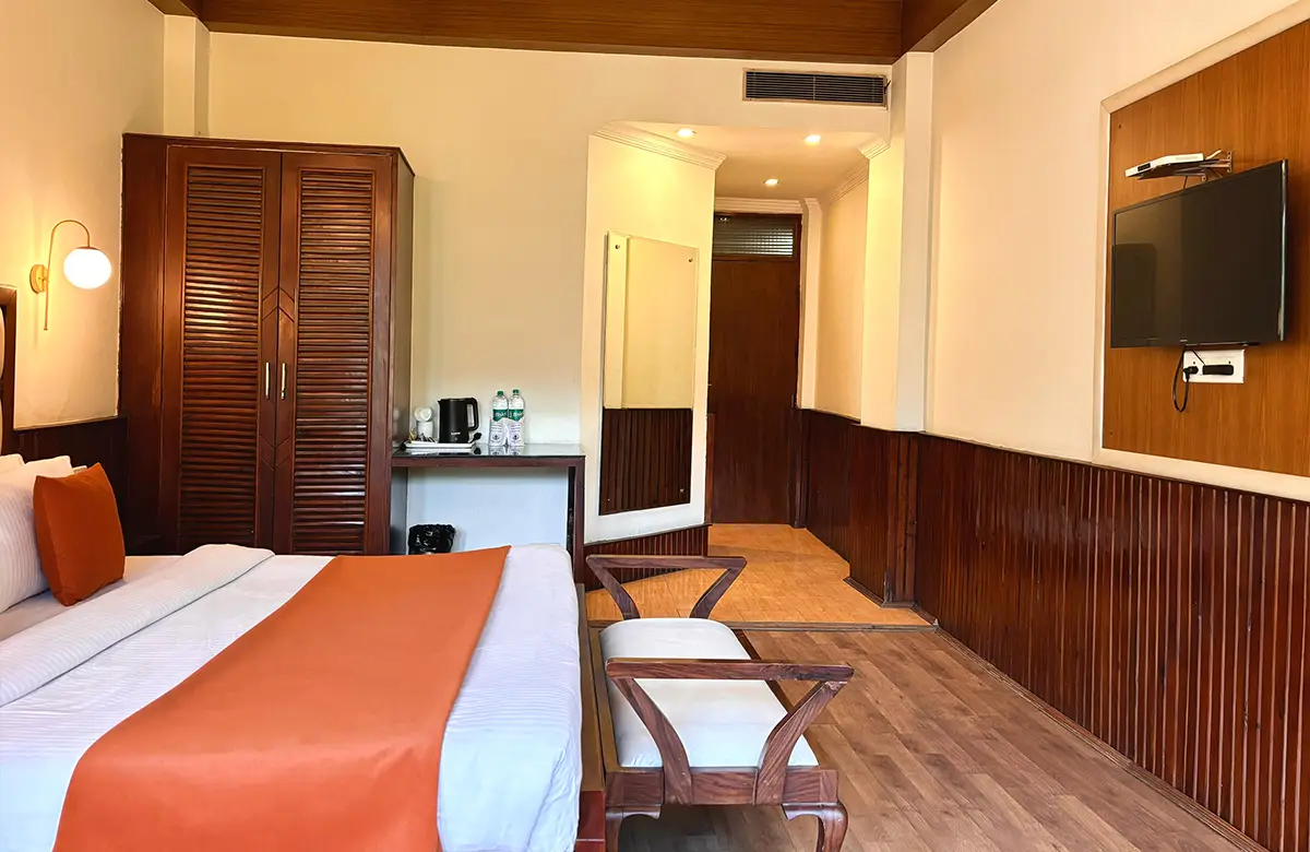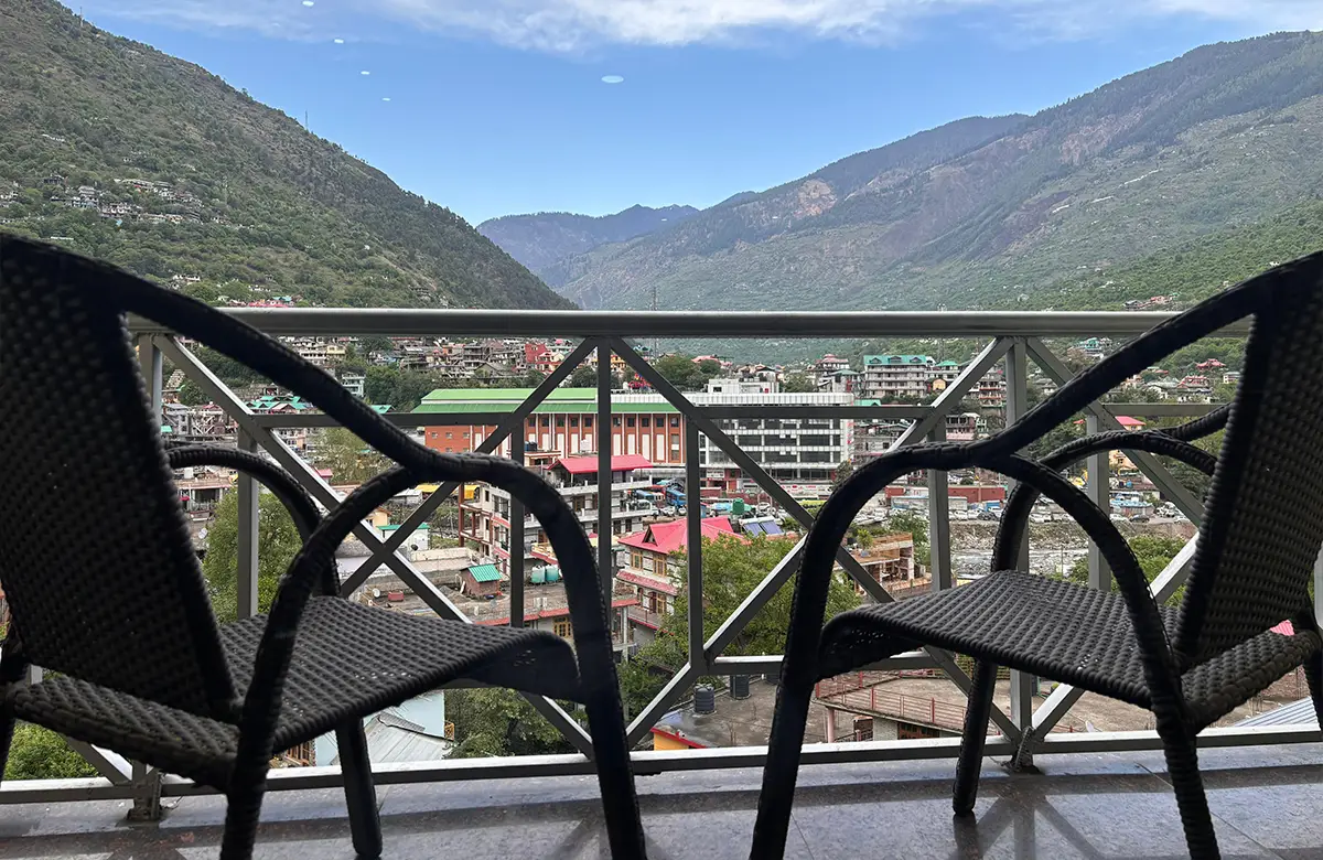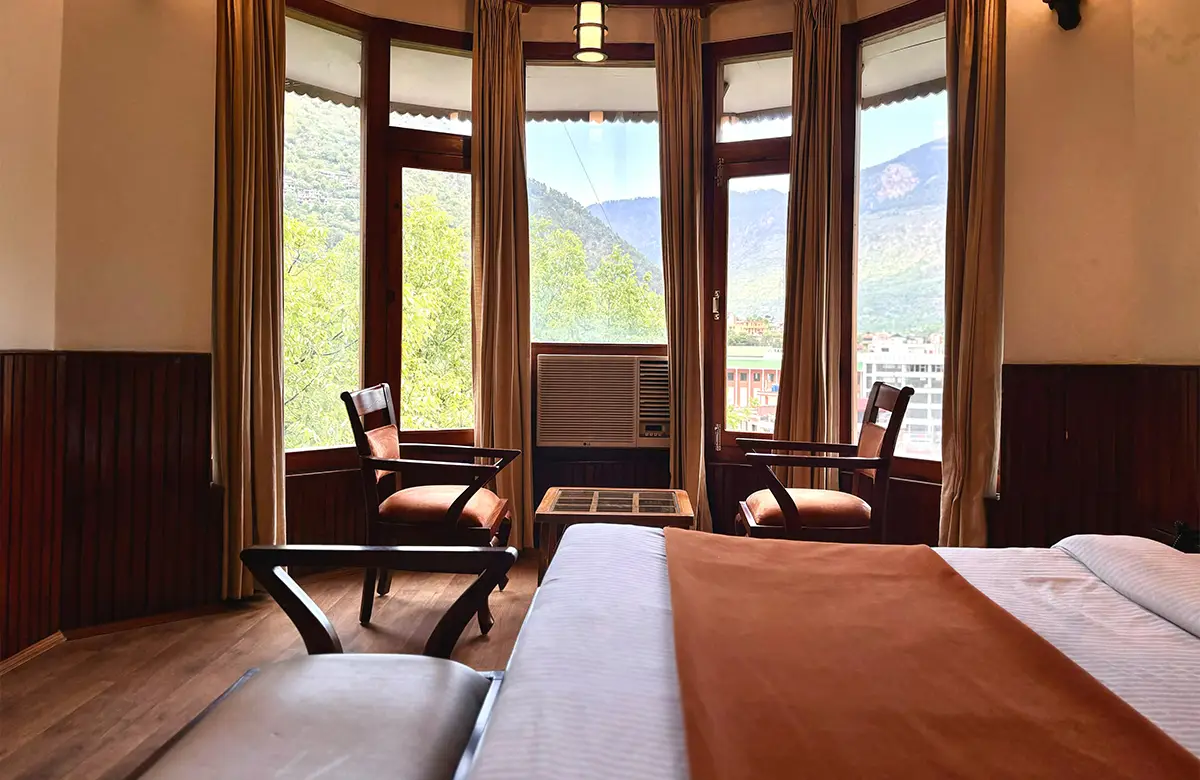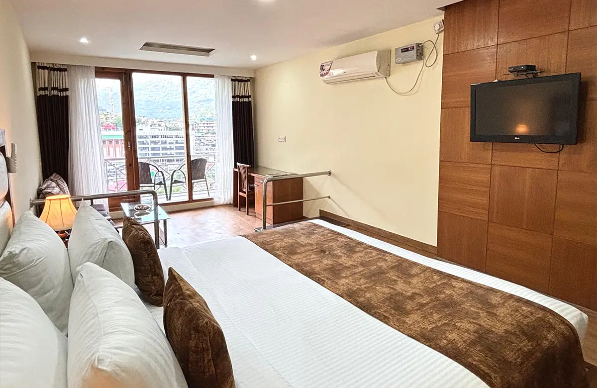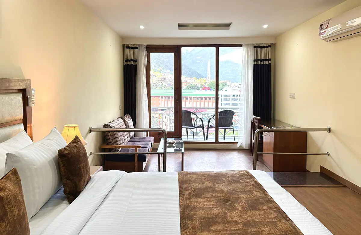 Spacious valley-view rooms with king beds, wooden interiors, LED TV, seating areas and modern amenities for a restful stay in Kullu.