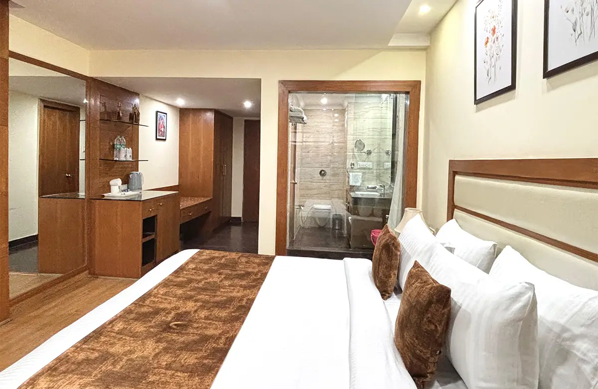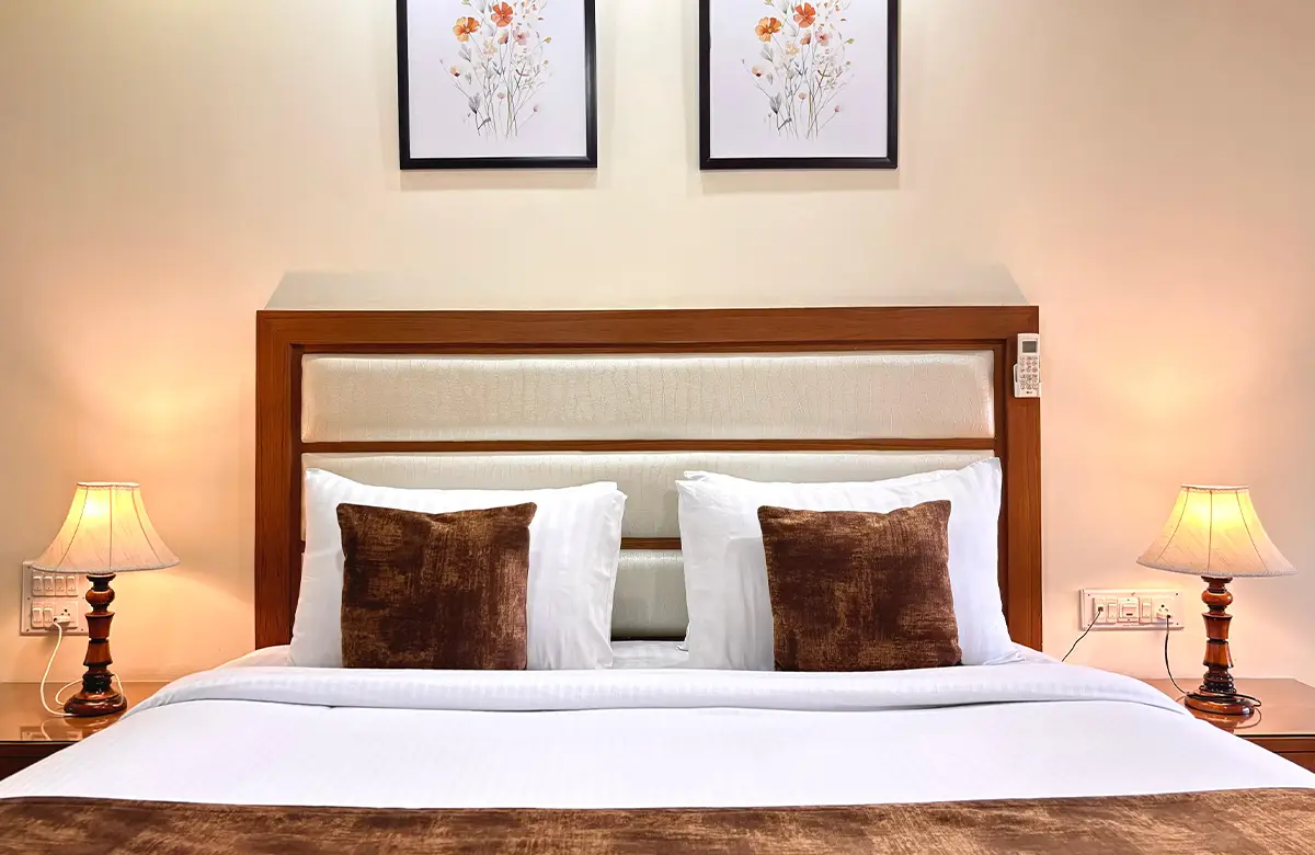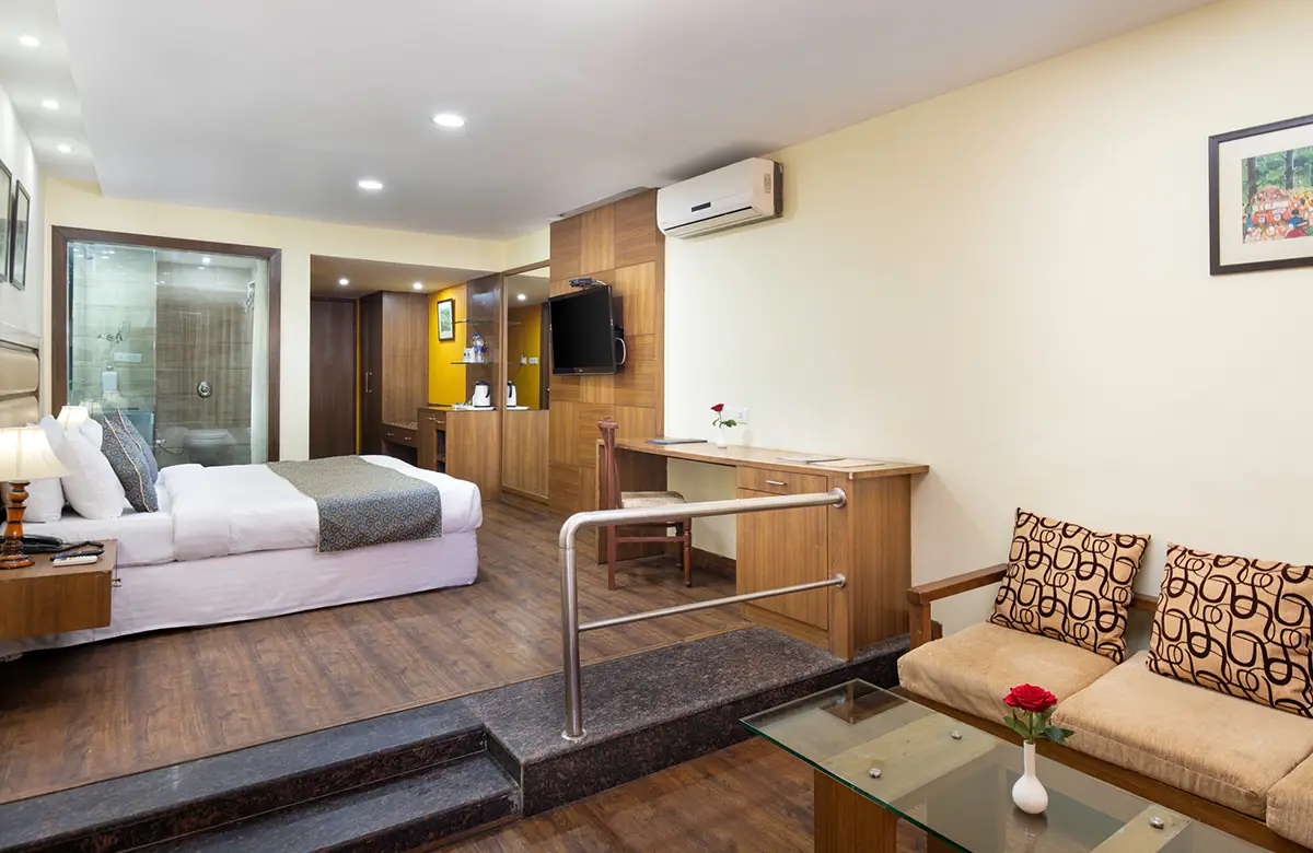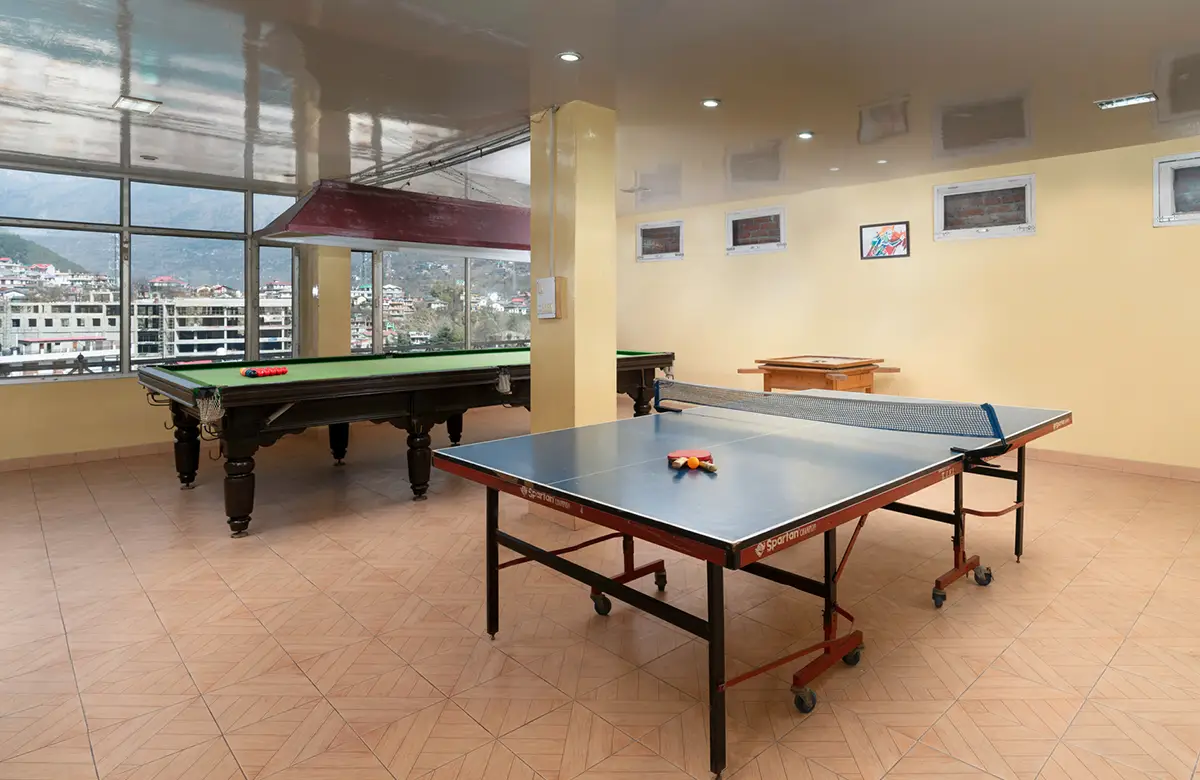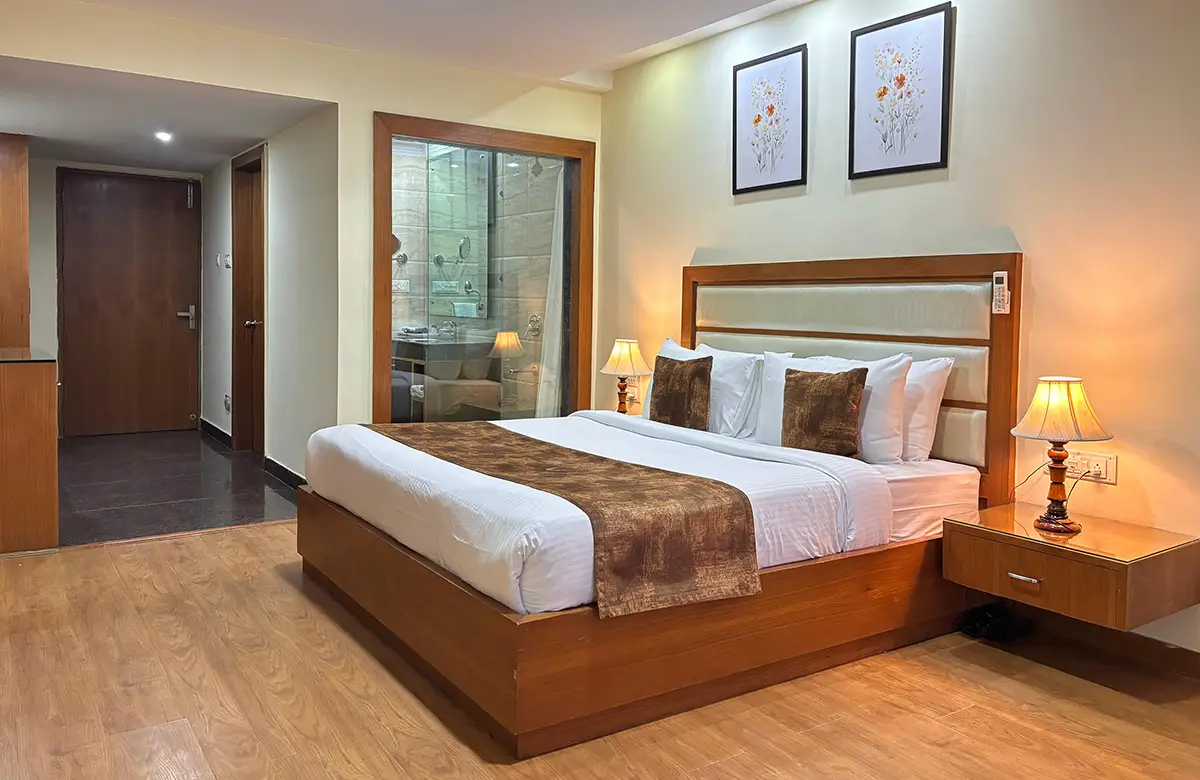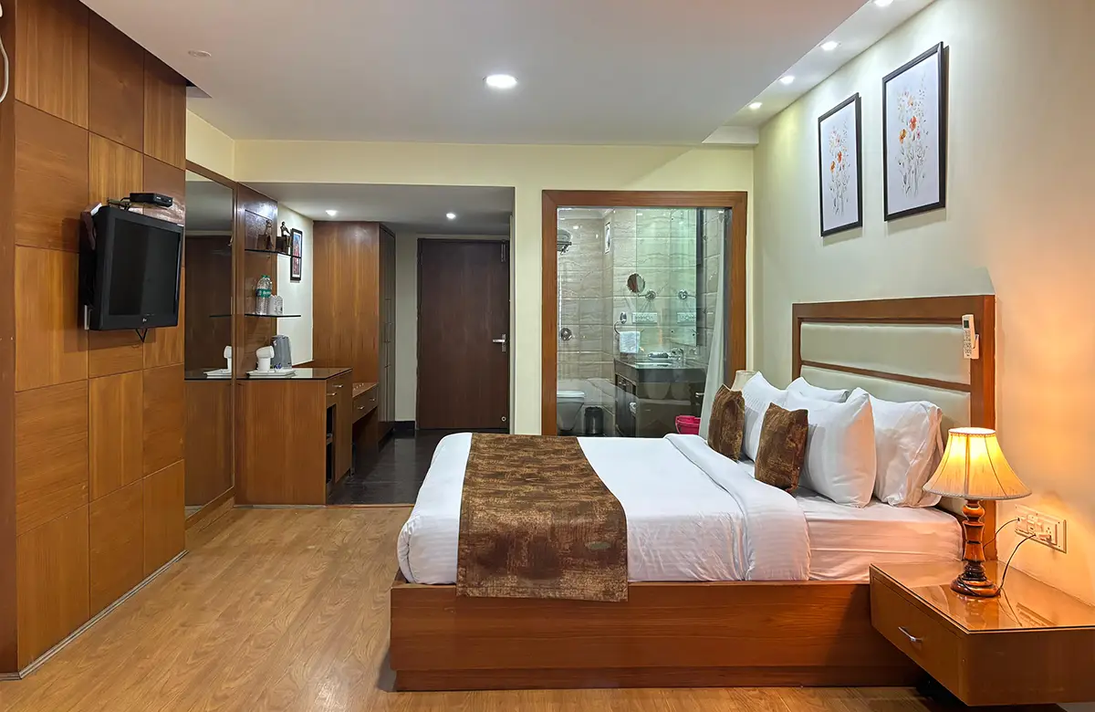 Spacious valley-view rooms with king beds, wooden interiors, LED TV, seating areas and modern amenities for a restful stay in Kullu.